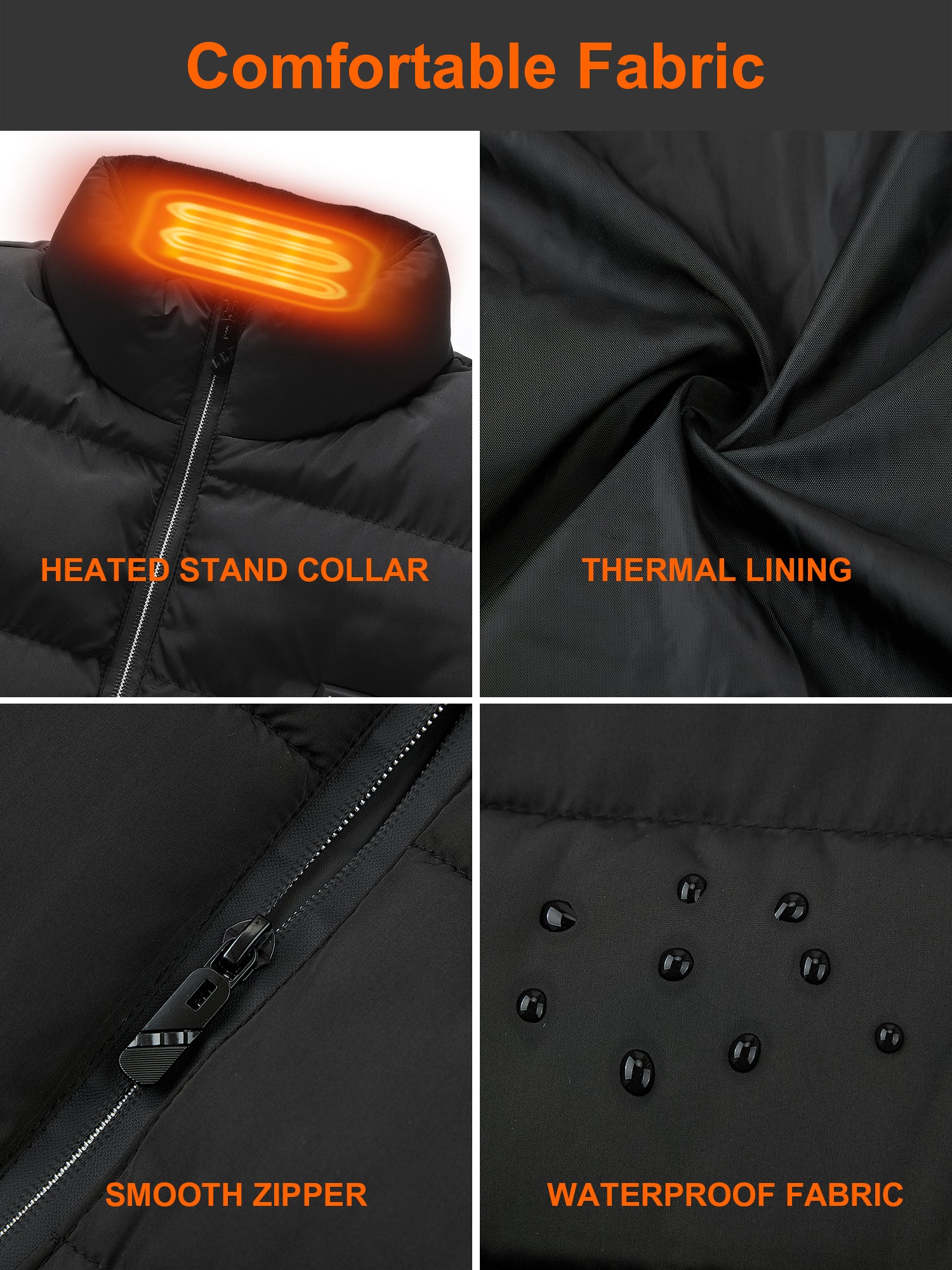 - 15 carbon fiber heating elements (left & right pockets, collar, upper back, and lumbar area) provide full-body warmth, including extra support for your lower back.