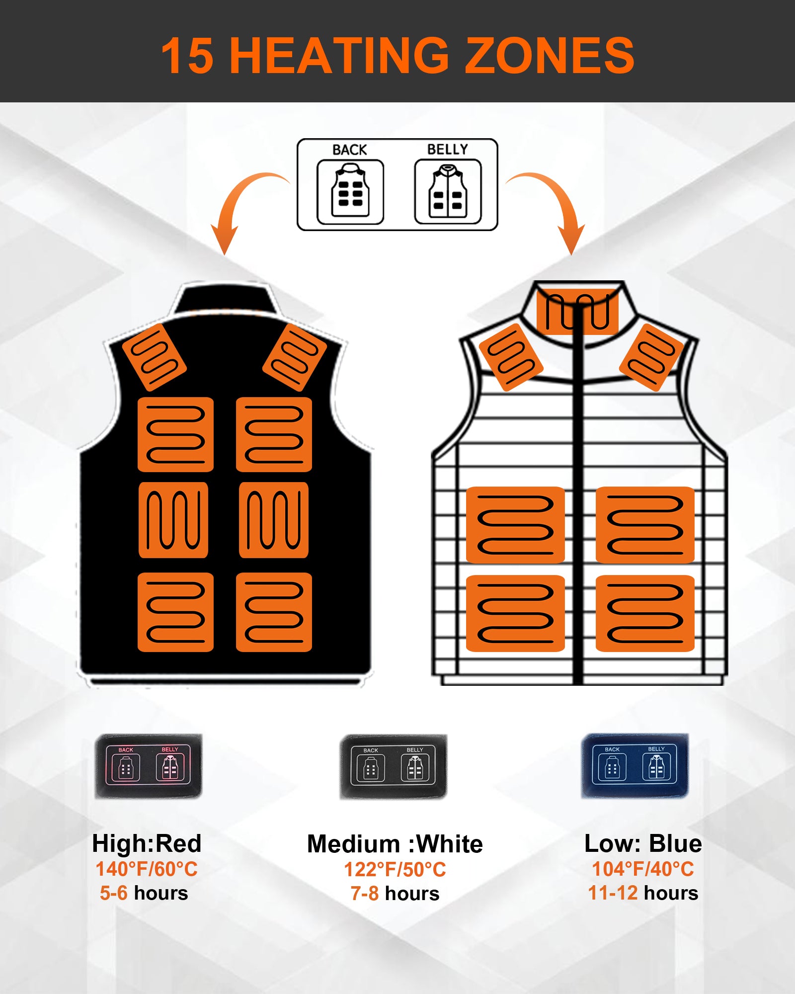 - Enjoy up to 12 hours of warmth on a single charge (5–6 hours on high, 7–8 hours on medium, 11–12 hours on low) with 20000mah Battery.